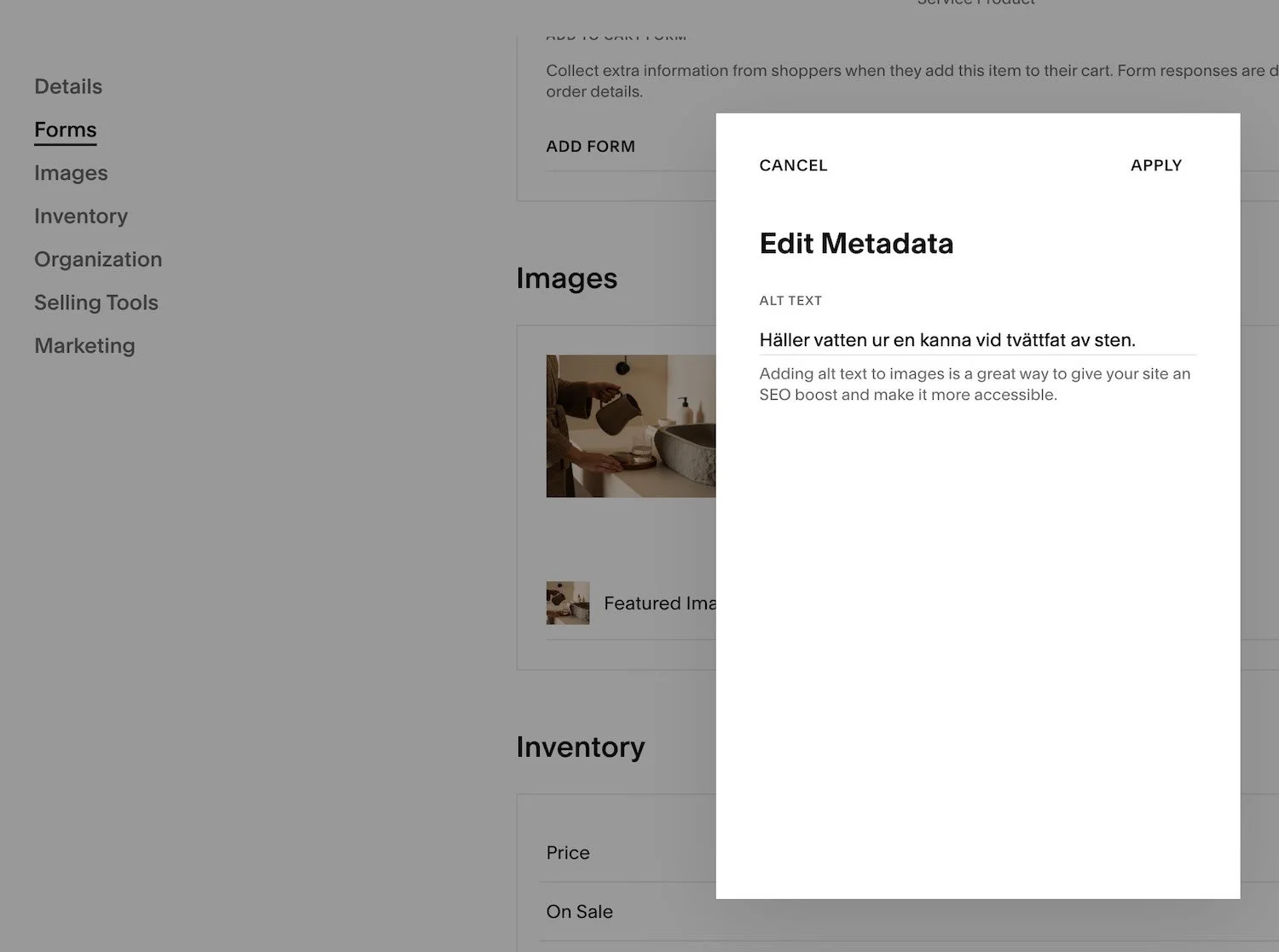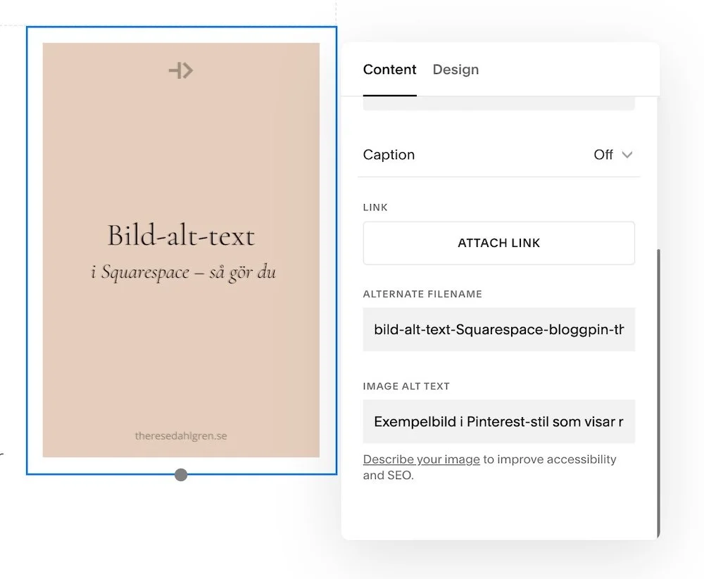 I Squarespace försvinner alt-texten om du byter bild i ett bild-block. Det är helt naturligt – en ny bild behöver också få en ny alt-text. Kom bara ihåg att fylla i den igen, även om du byter ut bilden för att exempelvis ersätta en oskarp version.